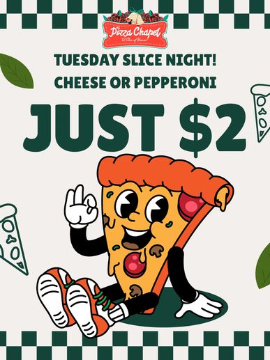 Enjoy a slice of our cheese or pepperoni pizza every Tuesday for just $2! Dine in only. Max of 2 slices per customer.