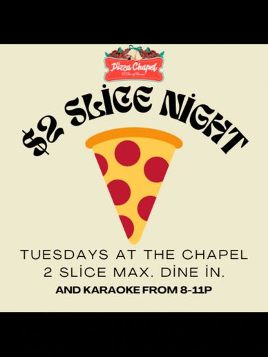 Enjoy a quarter slice of our large cheese or pepperoni every Tuesday for just $2! Dine in only. Max of 2 slices per customer.